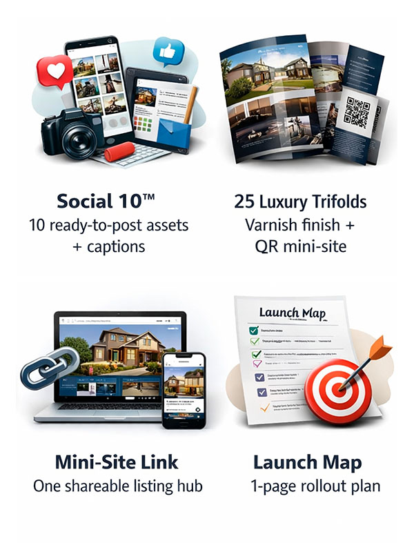 We produce your Social 10™, captions, Signature Listing Portfolios, mini-site link, and Launch Map.
