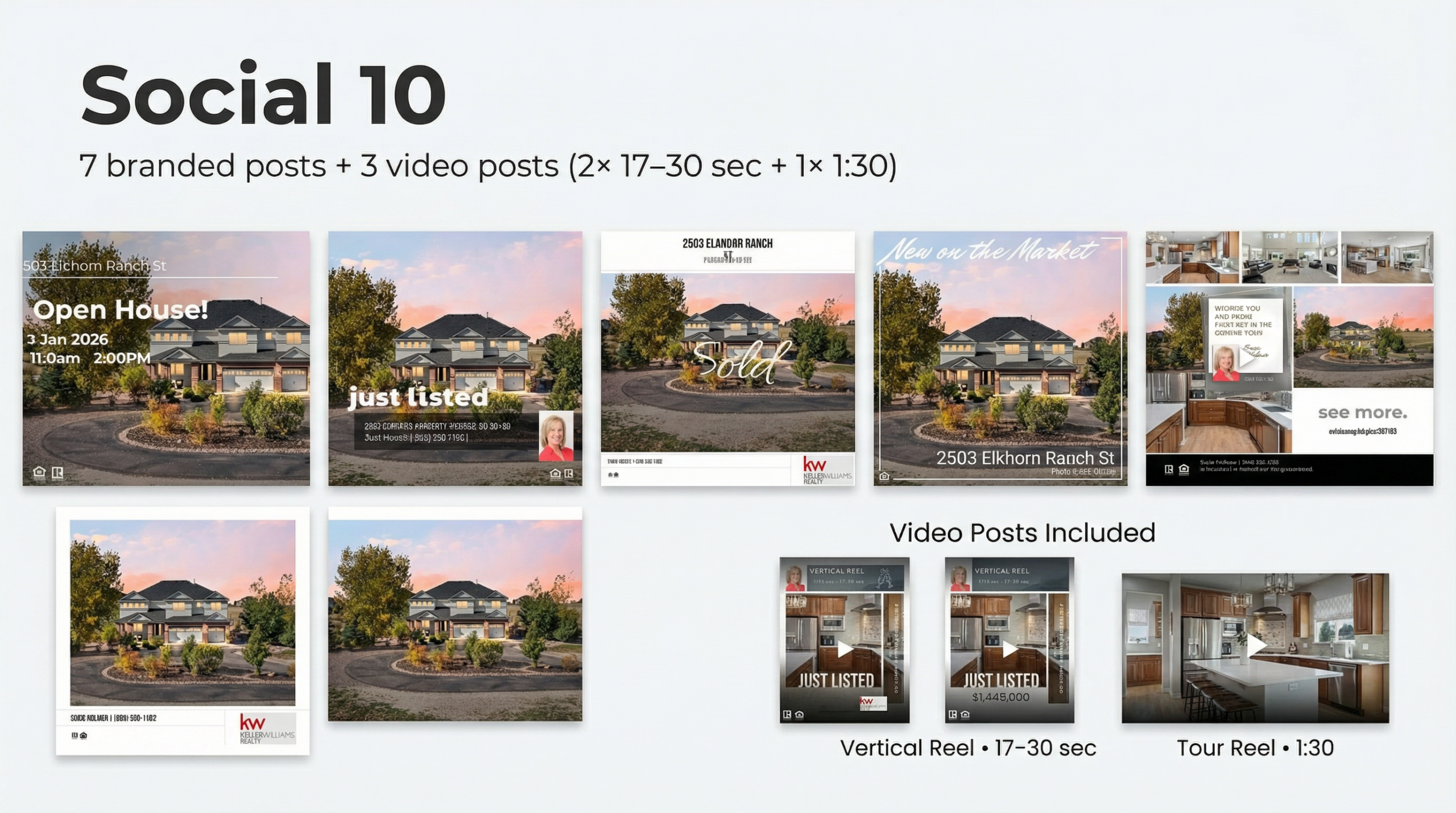Social 10™ is a complete 10-post listing content kit designed to drive measurable traffic back to your listing throughout the life of the listing—without you writing a thing.