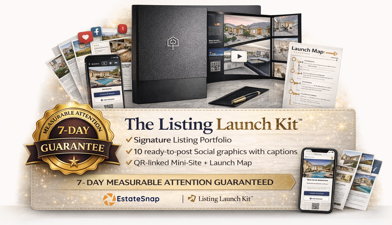 The Listing Launch Kit™ solves that with a simple, done-for-you launch system: the Signature Listing Portfolio for in-person presentations, plus Social 10™ as your social marketing engine—both linked to your mini-site to drive trackable traffic back to the listing. No new system to learn. Just plug in your listing and launch.
