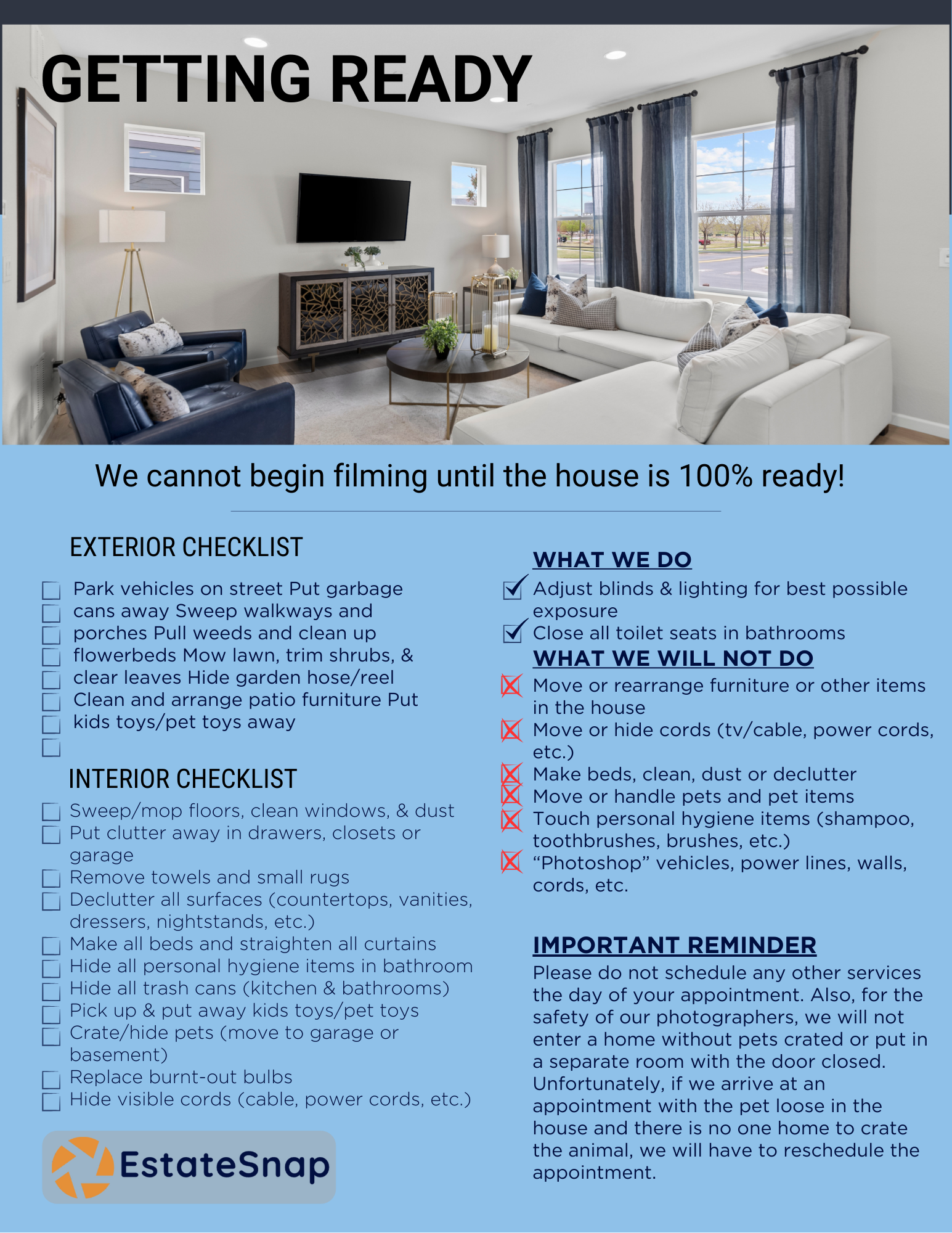 The success of your appointment depends largely on YOU and your preparation. To create the best media we need all homes to be 100% “show” ready when we arrive. The following information below provides a checklist to organize every room in your home. We will do our part; now we ask that you help by getting your home ready!